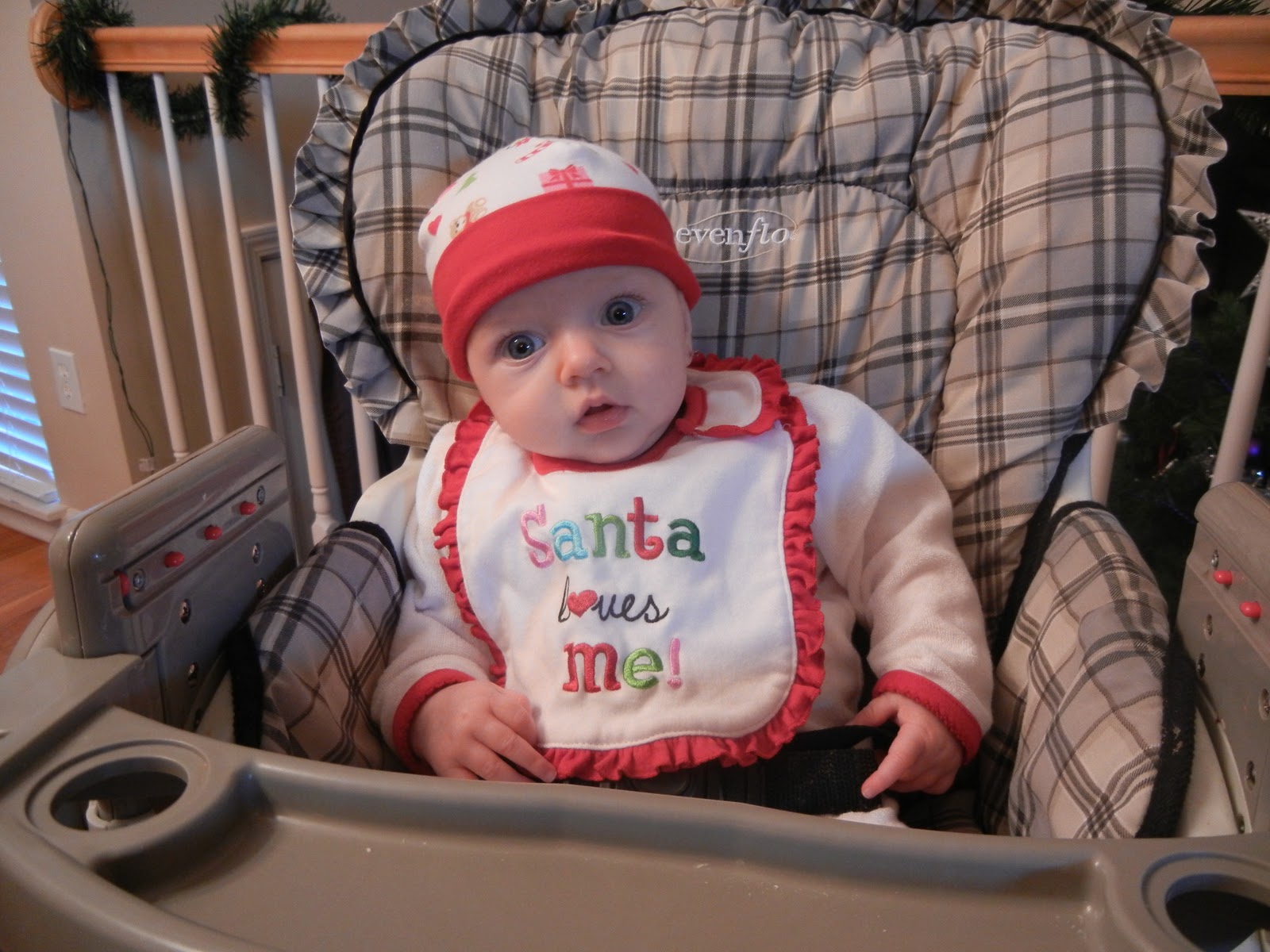 Wow, what a whirlwind month this has been. I had starting feeling sick before my last post and it just got worse. I was down for a week and a half and even went to urgent care I had felt so bad. It started with a sore throat and each day a new symptom came and I felt horrible.I had a bad upper respiratory infection that turned into a sinus infection. Thank goodness for my amazing husband, he took such good care of me and Addy and I don't know what I would have done without him. I was worried about Addy getting sick but she did awesome and I am just hoping she continues to stay well. Jared ended up getting a cold but was able to shake it off pretty quickly. We got Addy's Christmas pictures taken and a few 5 month pics too. She was so funny. We did the Christmas ones first and she wasn't crying but had few smiles, I fed her before the 5 month ones and she was a happy girl, smiling and interacting with the girls taking the pictures. I love seeing her expressions and watching those beautiful big blue eyes as she takes in EVERYTHING around her and you can just see the wonder and amazement in her eyes. She makes the holiday season so much more fun and is the best gift EVER!! Since the last post she has started doing a few new things, one is flapping her arms to her sides when she gets excited, and looks like a penguin, she can hold and put in her pacifier (which she only takes when she is tired) and takes it out. She has started spitting when she blows bubbles. She pulls herself up to the little bar on the front of her highchair when she is sitting in it and wants to reach something, she also sits up really well with her boppy and on our laps. When we try to let her sit by herself, she is top heavy and just leans forward most of the time. She reaches for her toys, the remote, and has held her arms out once for me. She also started panting this week when she gets excited and smiles and even starts to laugh a little when you do it back. We got our first real laugh from her Wednesday night and we tried to get her to do it again so we could video her and of course she wouldn't. She is changing so fast and getting so big. Everyone that sees her says she is still so little and petite. She seems big to us and looking back at some of her pictures the past few months, it is hard to believe she was so little. I went through her clothes and packed away the ones that were too small and started washing up her 3-6 month and 6 month sizes. The 3-6 month stuff is too big around her little waist so she still wears a lot of 0-3 and 3 month sized but is quickly getting too long for them. She eats cereal in the morning and evening. She started on oatmeal cereal in the mornings this week and is not too sure of it, but loves her rice cereal. She has been sleeping really well for a few weeks now at night, usually going to bed between 9:30 and 10:30 and sleeping til 6 or so. Her naps are shorter during the day unless we are out and about, she sleeps really well when shopping and in the car!